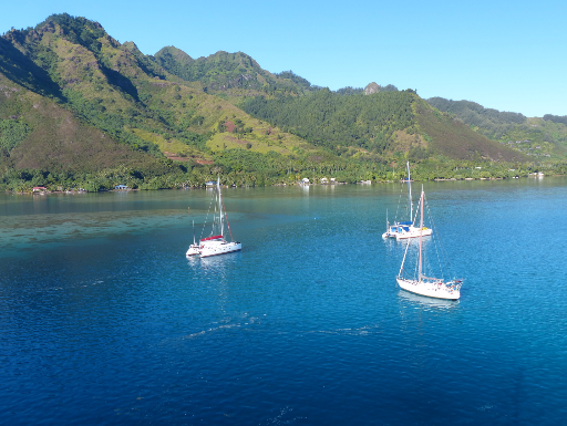 Tag 2. Malersiche Frühstücksüberfahrt nach Moorea. Wir liegen vor Moorea und genießen den Start unseres Törns